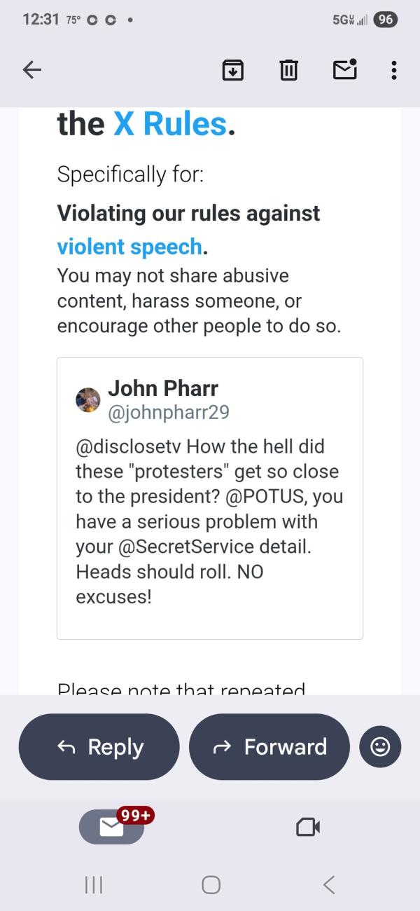 X censors user's post discussing the performance of the Secret Service: An X user shared a screenshot of her censorship notice. The user had posted "How the hell did these 'protesters' get so close to the president? @POTUS, you have a serious problem with your @SecretService detail. Heads should roll. NO excuses!" The user's comment was removed by X citing its "rules against violent speech."