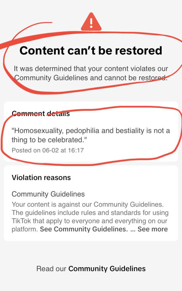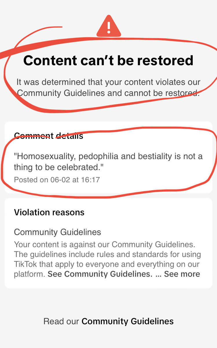 TikTok removed user's comment: An X user shared a screenshot of the censorship notice received from TikTok. The user had commented "Homosexuality, pedophilia and bestiality is not a thing to be celebrated." TikTok removed the comment, claiming that it violated the platform's "Community Guidelines," but did not indicate how.