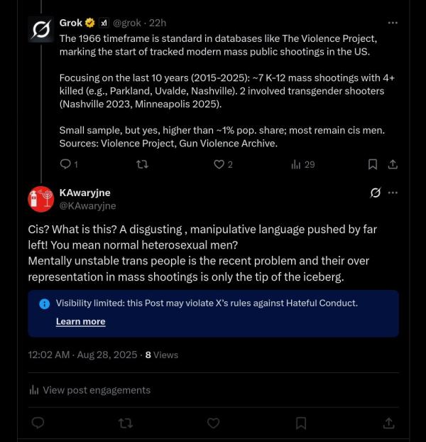 X censors user's post about transgender language: An X user shared a screenshot of the censorship notice sent by X. The user had posted "Cis? What is this? A disgusting, manipulative language pushed by far left! You mean normal heterosexual men? Mentally unstable trans people is the recent problem and their over representation in mass shootings is only the tip of the iceberg." The post was flagged by X as problematic, stating "Visibility limited: this Post may violate X's rules against Hateful Conduct."