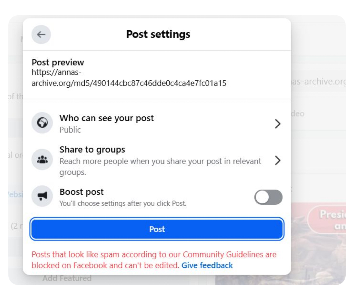 Facebook blocks post: User KFA-UK posted a screenshot August 5 showing Facebook blocked a link on anti-Japanese revolution from posting. “Posts that look like spam according to our Community Guidelines are blocked on Facebook and can’t be edited,” Facebook wrote.