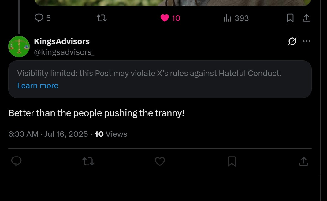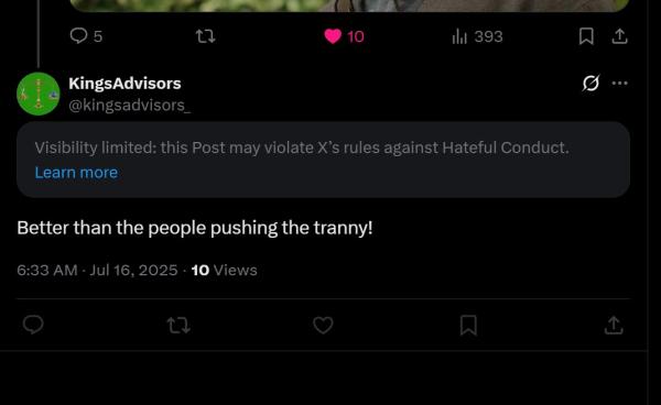 X censors user's post about transgenderism: An X user posted a screenshot of another user's censorship notice. The censored user had posted "Better than the people pushing the tranny!" The screenshot showed that X claimed the post "may violate X's rules against Hateful Conduct." The platform limited the visibility of the post.