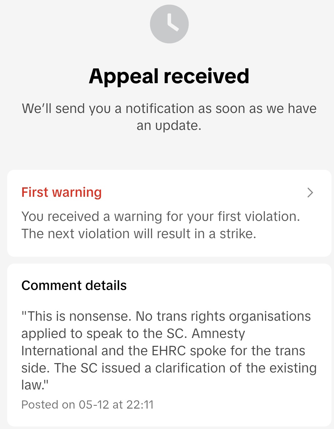 TikTok censors user's comment about transgenderism: An X user shared a screenshot of her TikTok censorship notice. The user had posted "This is nonsense. No trans rights organisations applied to speak to the SC. Amnesty International and the EHRC spoke for the trans side. The SC issued a clarification of the existing law." According to the screenshot, TikTok deleted the comment and provided a warning to the user's account, but it did not specify why the comment was removed. The user noted that when she appealed, TikTok restored the comment.