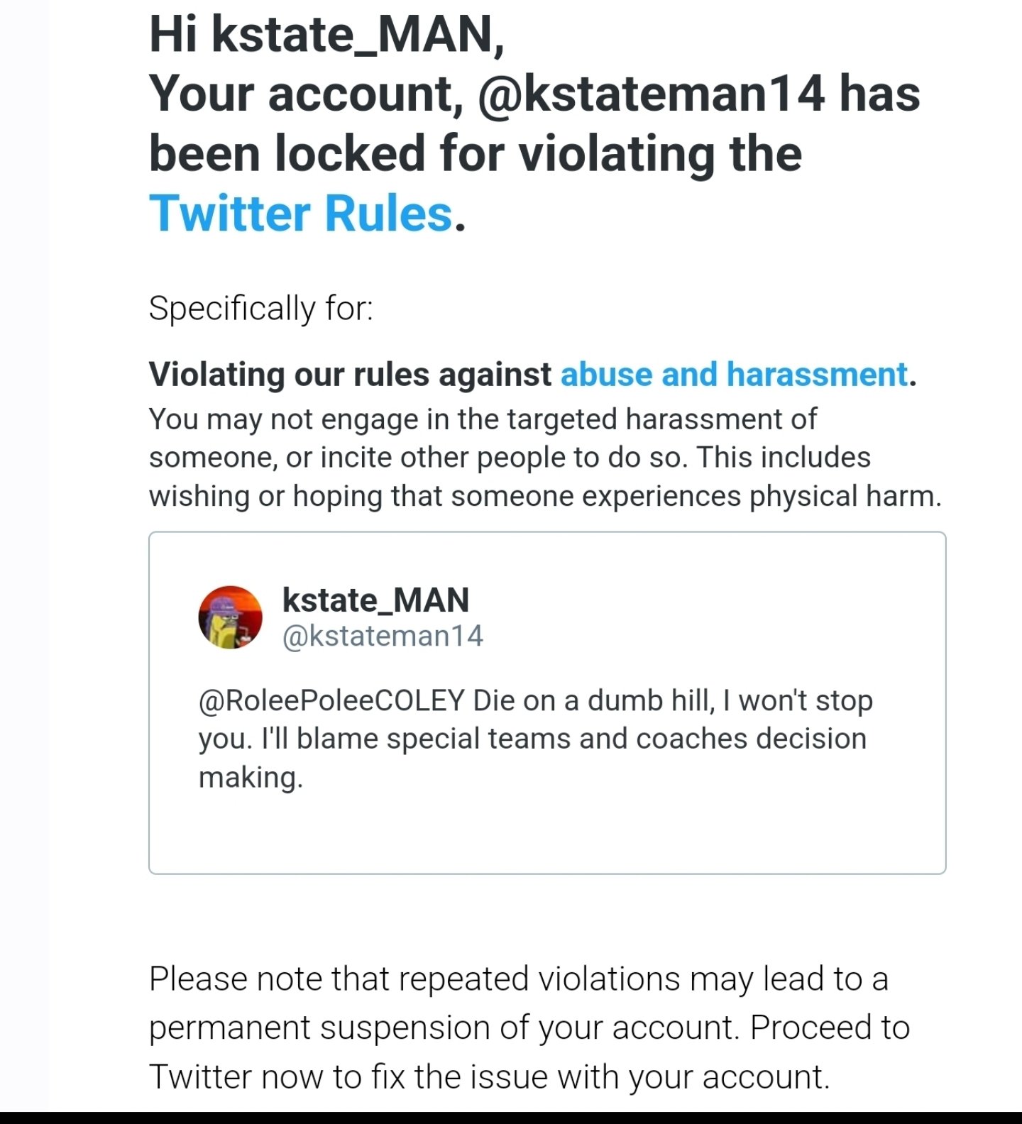 X censors user's post about football: An X user shared a screenshot of the censorship notice received from the platform. The user had posted "Die on a dumb hill, I won't stop you. I'll blame special teams and coaches decision making." X found this post violated its "rules against abuse and harassment." The user's post was removed and his account was locked.