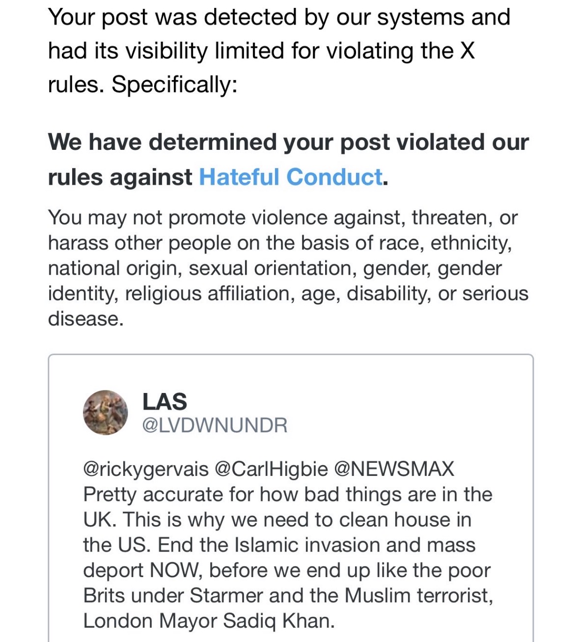 X limited visibility on post criticizing mass migration: User LAS shared a screenshot on Nov. 2 showing X limited the visibility of the user's post, “@rickygervais @CarlHigbie @NEWSMAX Pretty accurate for how bad things are in the UK. This is why we need to clean house in the US. End the Islamic invasion and mass deportation NOW, before we end up like the poor Brits under Starmer and the Muslim terrorist, London Mayor Sadiq Khan.” X notified the user that it had limited the visibility of the post for “Hateful Conduct.” X warned, “You may not promote violence against, threaten, or harass other people on the basis of race, ethnicity, national origin, sexual orientation, gender, gender identity, religious affiliation, age, disability, or serious disease.”