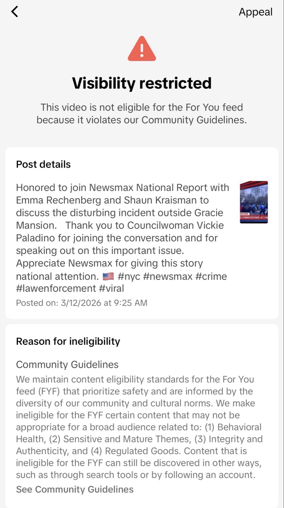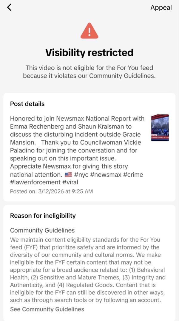 TikTok limited visibility for post highlighting New York Muslim terror attack: On March 25, political activist Lattina Brown posted a screenshot on X, showed TikTok limited visibility for her post, “Honored to join Newsmax National Report with Emma Rechenberg and Shaun Kraisman to discuss the disturbing incident outside Gracie Mansion. Thank you to Councilwoman Vickie Paladino for joining the conversation and for speaking out on this important issue. Appreciate Newsmax for giving this story national attention. #nyc #newsmax #crime #lawenforcement #viral.” TikTok claimed it violated Community Guidelines. “We maintain content eligibility standards for the For You feed (FYF) that prioritize safety and are informed by the diversity of our community and cultural norms" including "Sensitive and Mature Themes" and "Integrity and Authenticity."