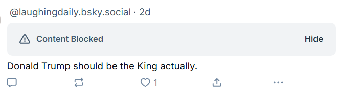 BlueSky censors user's post about Trump: An X user shared a screenshot of a BlueSky censorship notice. An account on BlueSky had posted "Donald Trump should be the King actually." BlueSky blocked the post, according to the screenshot, but did not provide a reason.