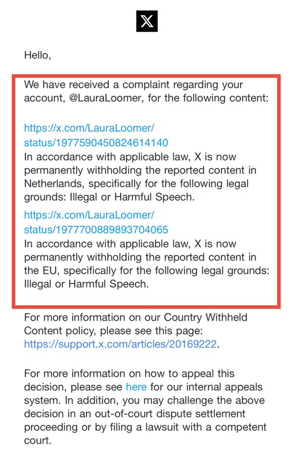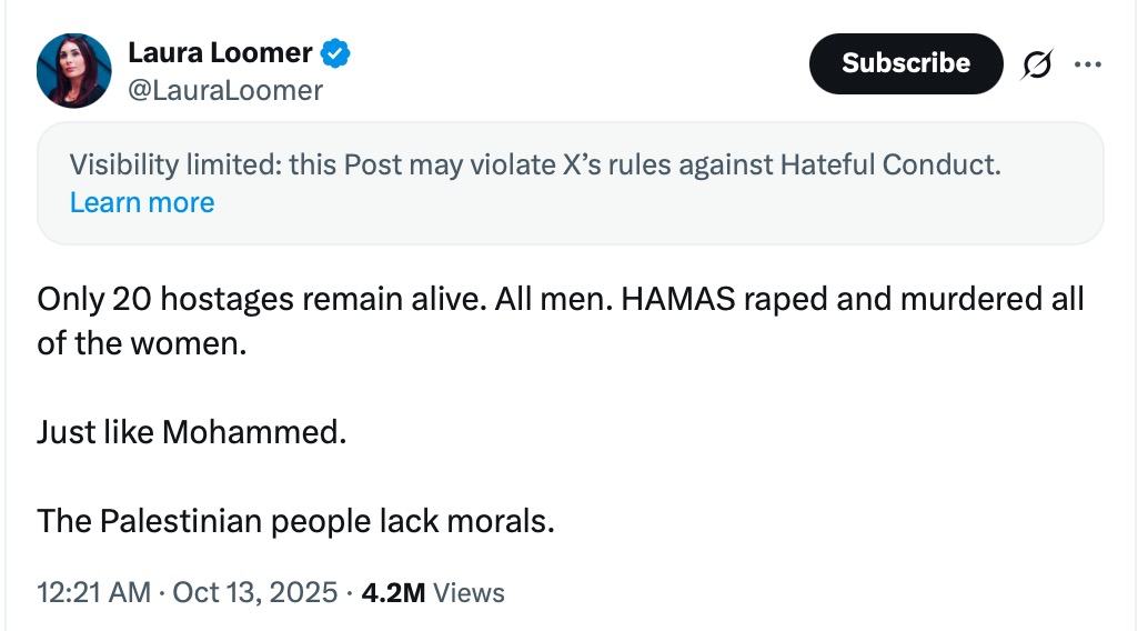 X censors Laura Loomer post about hostages held by Hamas: Political reported Laura Loomer's X post about Israeli hostages held by Hamas resulted in several violations. The post read "Only 20 hostages remain alive. All men. HAMAS raped and murdered all of the women. Just like Mohammed. The Palestinian people lack morals." In the United States, X limited the post's visibility, claiming it violated the platform's rules against "hateful conduct." Loomer also reported that X sent her notices that the post was found to constitute "Illegal or Harmful Speech" in both the Netherlands and the EU, and was therefore being permanently withheld in the applicable countries. Loomer noted that she "stand by everything [she] said and [she is] not deleting [her] tweets."