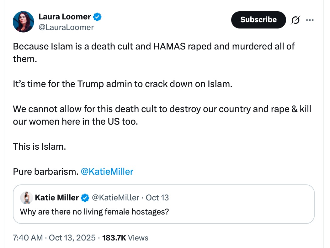 X censors Laura Loomer post about hostages held by Hamas: Political reported Laura Loomer's X post about Israeli hostages held by Hamas resulted in several violations. The post read "Because Islam is a death cult and HAMAS raped and murdered all of them. It’s time for the Trump admin to crack down on Islam. We cannot allow for this death cult to destroy our country and rape & kill our women here in the US too. This is Islam. Pure barbarism. @KatieMiller." This post was a response to Katie Miller's post that asked "Why are there no living female hostages?" Loomer reported that X sent her notices that the post was found to constitute "Illegal or Harmful Speech" in both the Netherlands and the EU, and was therefore being permanently withheld in the applicable countries. Loomer noted that she "stand by everything [she] said and [she is] not deleting [her] tweets."