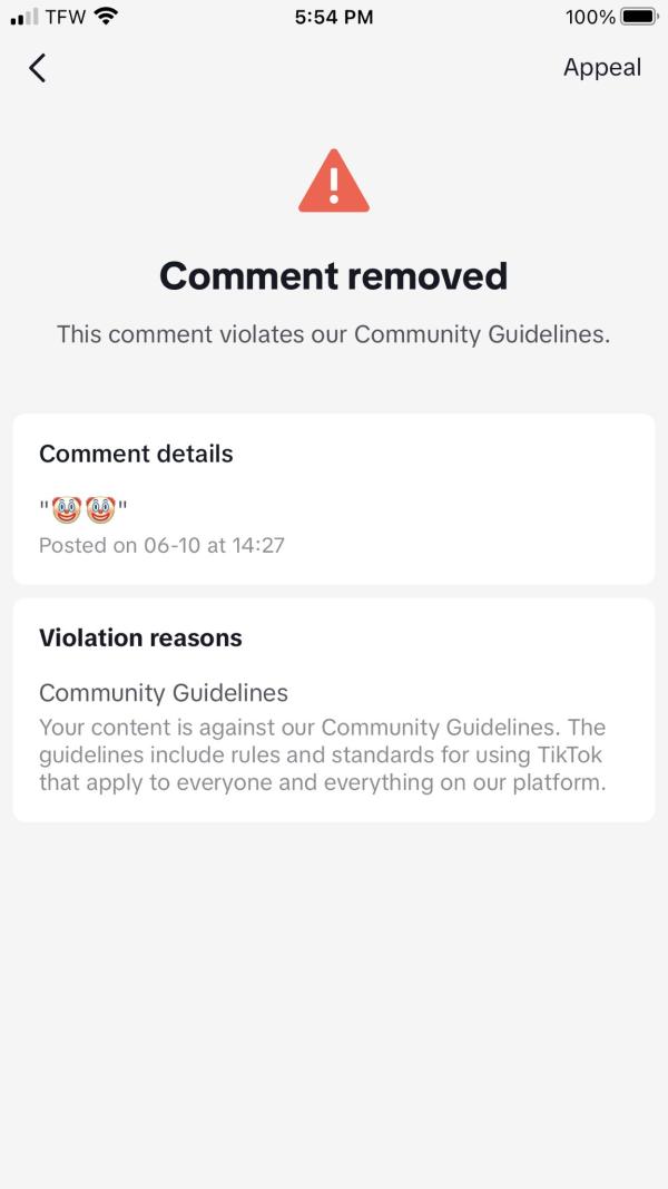 TikTok removed user's comment: An X user shared a screenshot of a censorship notice sent by TikTok. The user had commented using only two clown face emojis. TikTok removed the comment, claiming that it violated the platform's "Community Guidelines," but did not indicate how.