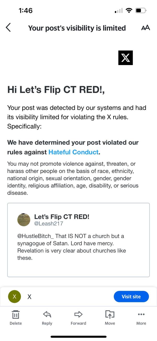 X censors user's post about LGBT-affirming church: An X user shared a screenshot of the censorship notice sent by X. The user had posted "That IS NOT a church but a synagogue of Satan. Lord have mercy. Revelation is very clear about churches like these." X flagged the post, stating that its visibility had been limited because it "violated our rules against Hateful Conduct."