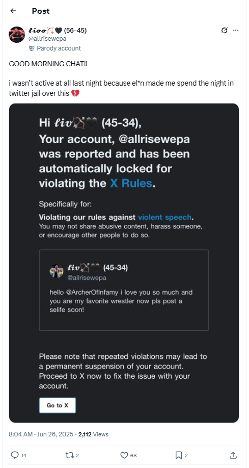X locks user's account: An X user shared a screenshot of a censorship notice from the platform. The flagged post read: “hello @ArcherOfInfamy i love you so much and you are my favorite wrestler now pls post a selfie soon!” X claimed the post violated its rules against violent speech. The account was reported and subsequently locked by the platform.