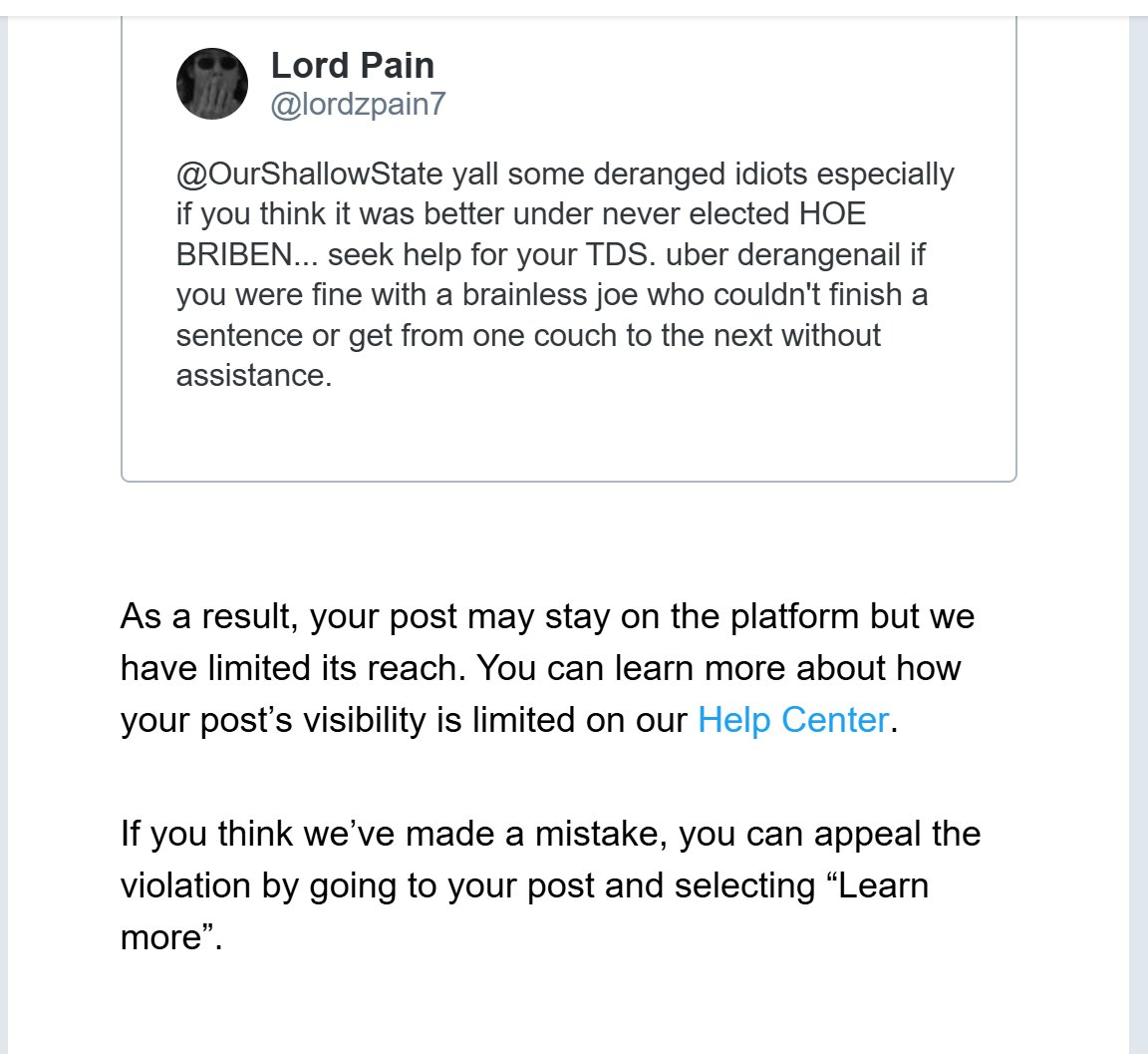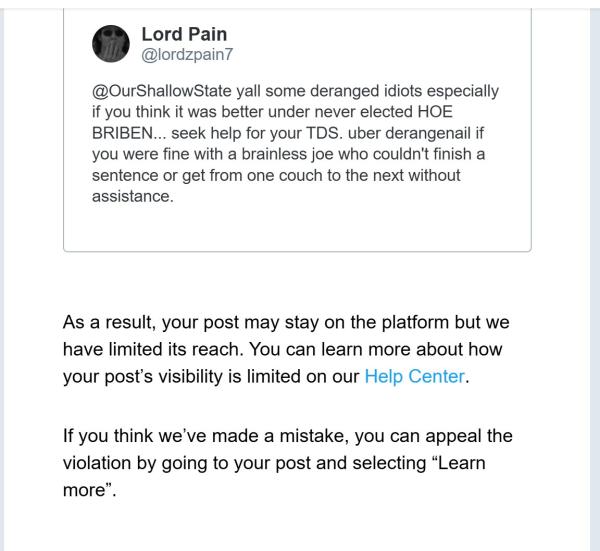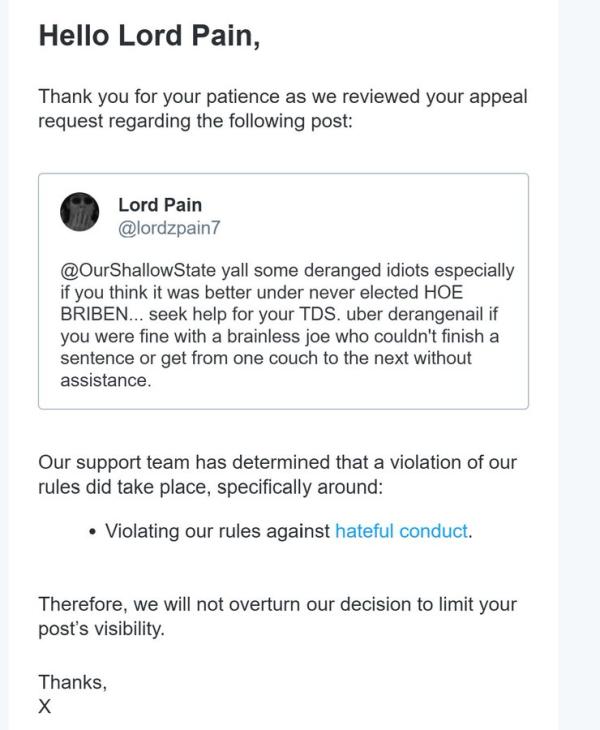 X censors user's post about Biden vs. Trump: An X user shared a screenshot of the censorship notice sent by X. The user had posted "yall [sic] some deranged idiots especially if you think it was better under never elected HOE BRIBEN... seek help for your TDS. uber derangenail if you were fine with a brainless joe who couldn't finish a sentence or get from one couch to the next without assistance." X flagged the post, stating that its visibility had been limited because it "violated our rules against Hateful Conduct."