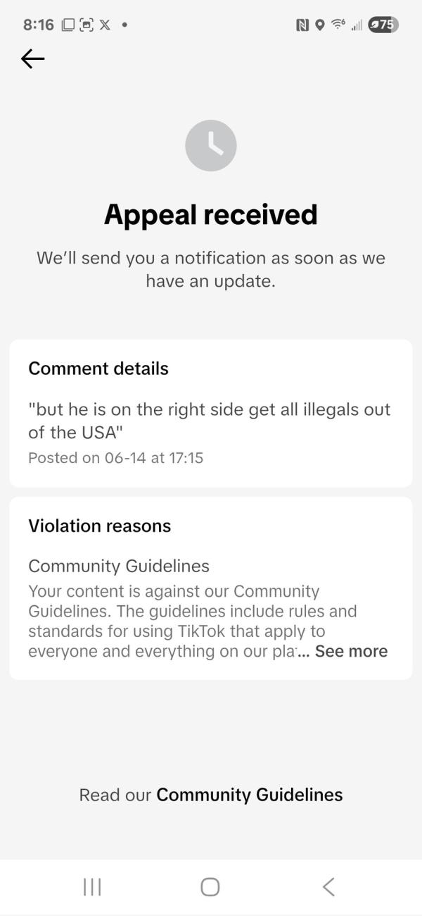 TikTok removed user's comment: An X user shared a screenshot of a censorship notice sent by TikTok. The user had commented "but he is on the right side get all illegals out of the USA." TikTok removed the comment, claiming that it violated the platform's "Community Guidelines," but did not indicate how.