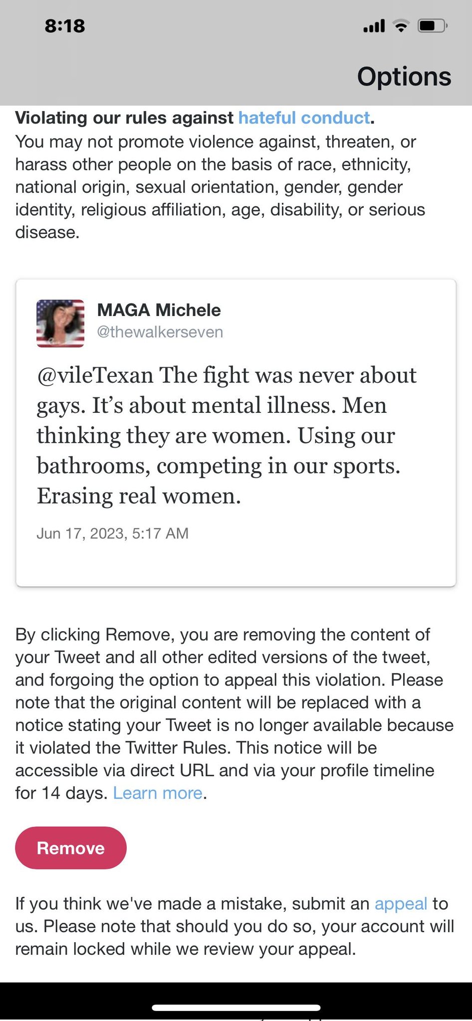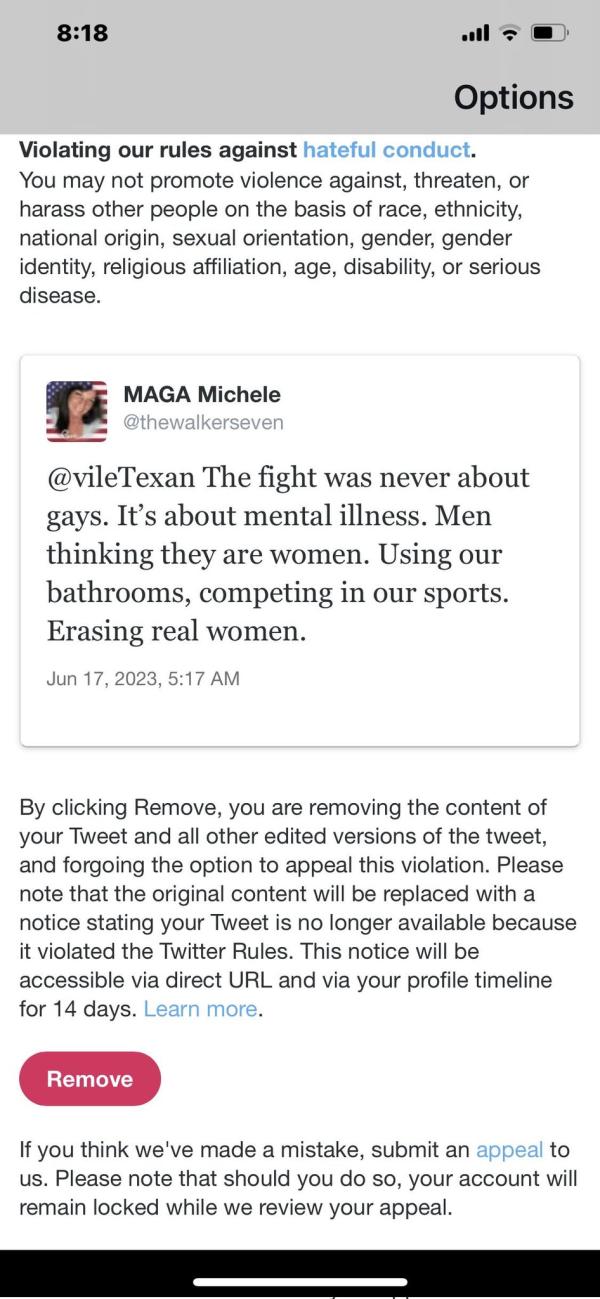 X censors user for post about transgenderism: An X user shared a screenshot of another user's censorship notice. The censored user posted "The fight was never about gays. It's about mental illness. Men thinking they are women. Using our bathrooms, competing in our sports. Erasing real women.'" X claimed this post violated its "rules against hateful conduct" and removed the post.