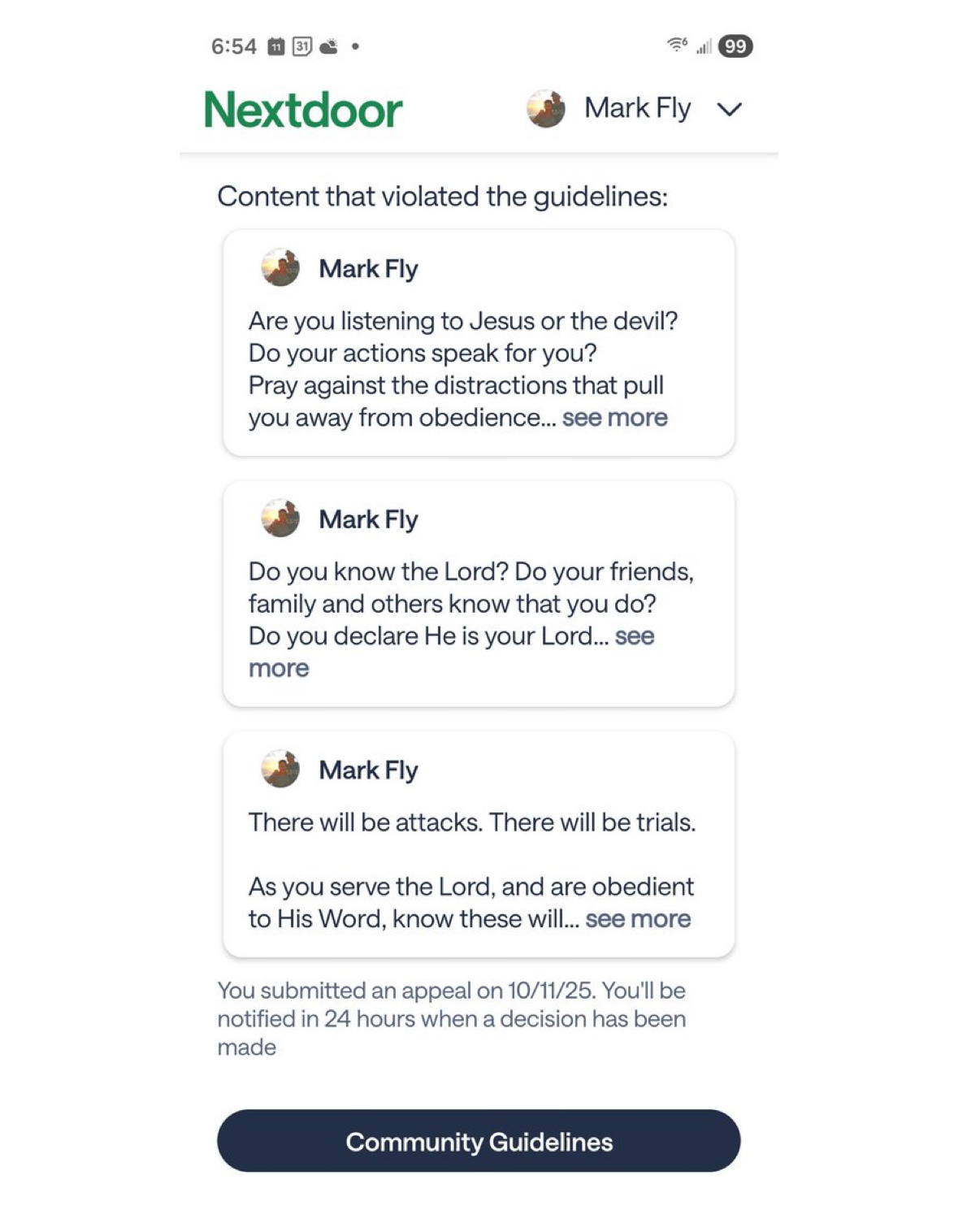 Nextdoor suspends user for scriptural posts: Mark Fly shared a screenshot on X Oct. 11 and stated that Nextdoor suspended him for posting Bible verses and messages inspired by them on the platform. His messages include “Do you know the Lord? Do your friends, family and others know that you do? Do you declare He is your Lord and Saviour? Do you tell them His name is above all names?What if YOU are the only one they will listen to? Tell them. Why? Jesus said.” Another asked, “Are you listening to Jesus or the devil? Do your actions speak for you? Pray against the distractions that pull you away from obedience to His Word.” The third message discussed how “There will be attacks. There will be trials. As you serve the Lord, and are obedient to His Word, know these will not prosper nor prevail! Why? Jesus said.” Nextdoor simply said the content “violated the guidelines.”