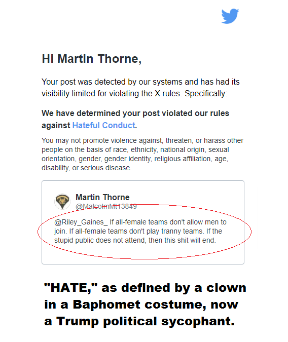 X censors user's post discussing transgenderism: An X user shared a screenshot of a censorship notice sent by the platform. The user had posted "If all-female teams don't allow men to join. If all-female teams don't play tranny teams. If the stupid public does not attend, then this shit will end." The user's comment's visibility was limited by X citing its "rules against hateful conduct."