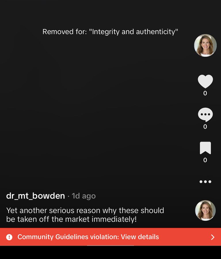 TikTok censors doctor's video questioning safety of the COVID-19 vaccines: Dr. Mary Talley Bowden, an outspoken critic of the response to COVID-19, had a recent video on her newly formed TikTok account removed. In the video, she explains that she and other experts believe the COVID-19 vaccines should be removed from the market because of high levels of DNA contamination. After posting the video to TikTok, she received a notice claiming that her video had been removed by the platform, citing "Integrity and authenticity" violations as the cause.
