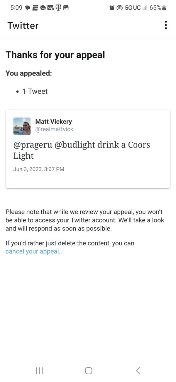 X censors user's post about not drinking Bud Light: An X user shared a screenshot of his censorship notice. He had posted a response to another post that asked users to complete the sentence, "I'd rather ________ than drink a Bud Light." This was in response to backlash against Bud Light's marketing promotion featuring so-called trans-woman Dylan Mulvaney. The user had responded in a post, saying "drink a Coors Light." X claimed this violated its "rules against promoting or encouraging suicide or self-harm." The user's account was restricted to read-only mode for twelve hours and the post was removed. The user appealed, and X reversed its decision.