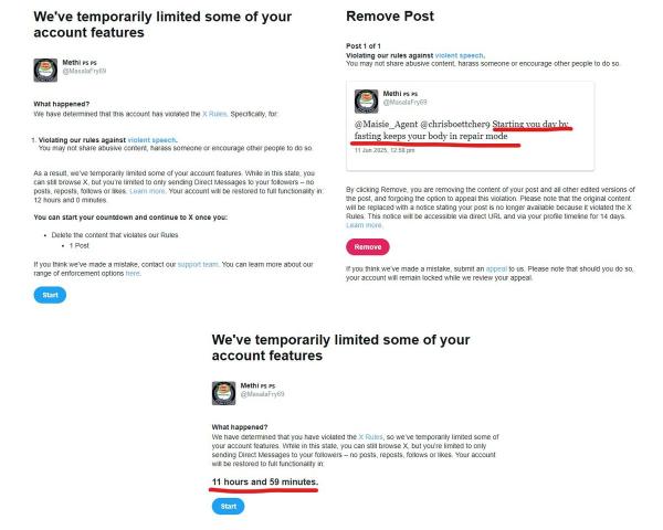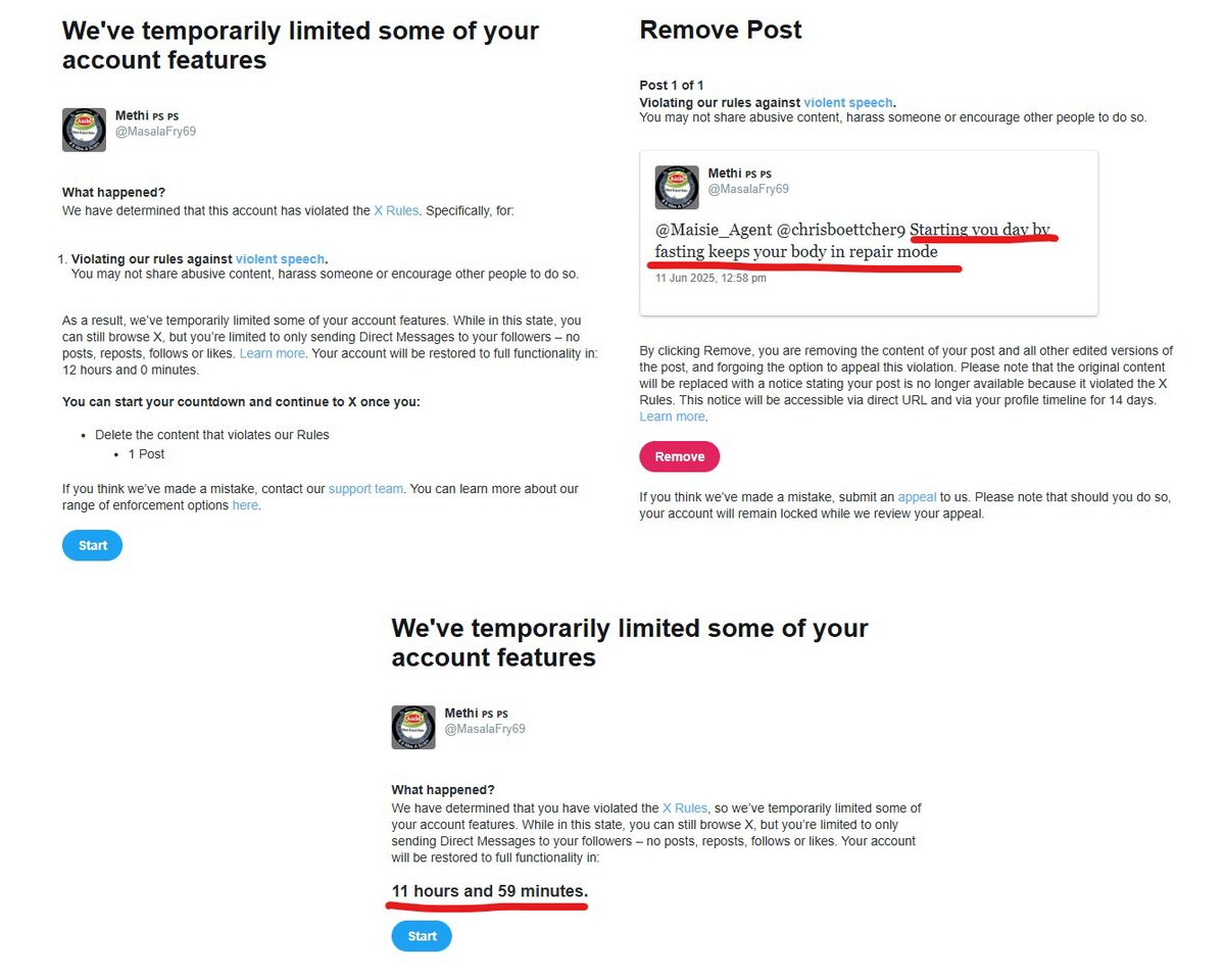 X censors user's post about fasting: An X user shared a screenshot of the censorship notice received from the platform. The user had posted "Starting you[r] day by fasting keeps your body in repair mode." X found this post violated its "rules against violent speech." The user's account was restricted to read-only mode and the user had to delete the post.