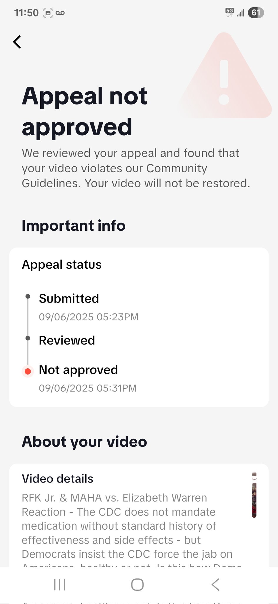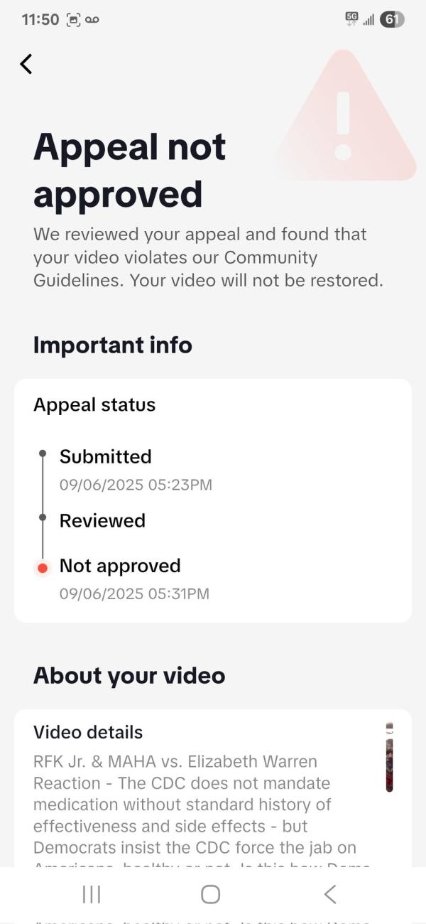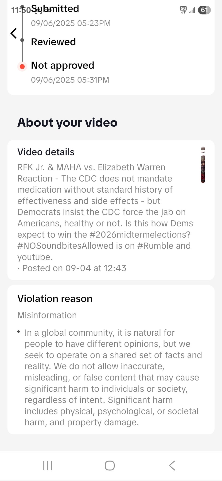 TikTok censors video that includes Senate hearing testimony about the COVID-19 vaccines: A user reported that a video he posted about the COVID-19 vaccines was removed from TikTok for "misinformation." The video's caption read "RFK Jr. & MAHA vs. Elizabeth Warren Reaction - The CDC does not mandate medication without standard history of effectiveness and side effects - but| Democrats insist the CDC force the jab on Americans, healthy or not. Is this how Dems expect to win the #2026midtermelections? #NOSoundbitesAllowed is on #Rumble and youtube." According to screenshots shared by the user on X, TikTok denied his appeal, citing "misinformation" as its reasoning.