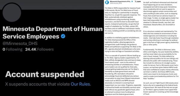 X briefly suspended the account that blew the whistle on reported "fraud" within the Minnesota government that directly implicated Gov. Walz. The social media platform reinstated the account after minor modifications and likely in response to widespread criticism condemning the censorship.