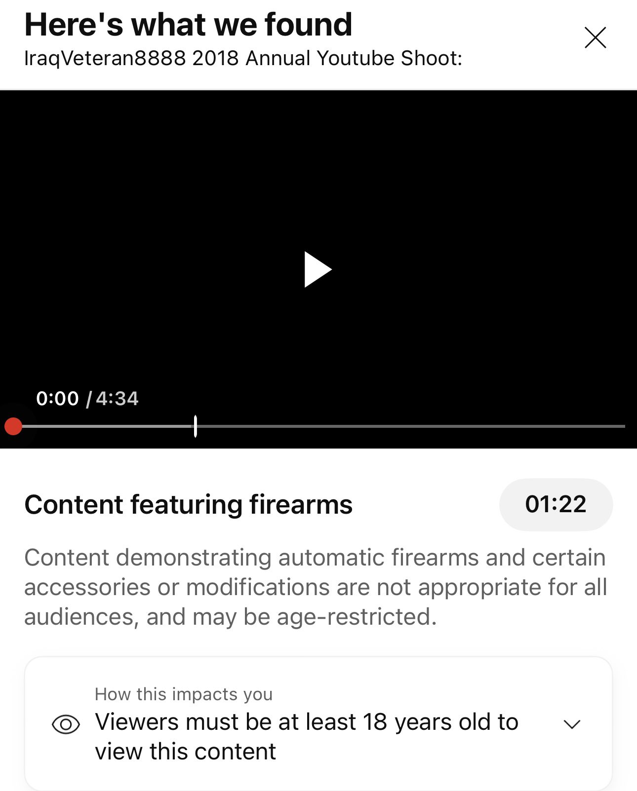 YouTube age-restricts a six-year-old video featuring firearms: MrGunsNGear, a popular gun channel on multiple social platforms, posted a copy of a censorship notice received from YouTube on its X channel. The video that was censored was posted to YouTube in October of 2018, but the channel received a censorship notice in July of 2025. The video included a montage of people shooting guns at an annual shooting event. According to the screenshot, YouTube determined that the video constituted "Content featuring firearms." It continued, saying that "Content demonstrating automatic firearms and certain accessories or modifications are not appropriate for all audiences, and may be age-restricted." The notice concluded, explaining "How this impacts you," that "Viewers must be at least 18 years old to view this content." At the time of MRC's review of the video, the age-restriction had been lifted.