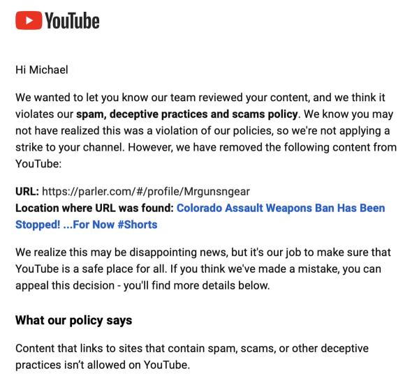 YouTube removes a video featuring firearms policy discussion: MrGunsNGear, a popular gun channel on multiple social platforms, posted a copy of a censorship notice received from YouTube to its X channel. The video that was removed was titled "Colorado Assault Weapons Ban Has Been Stopped! ...For Now #Shorts." According to the screenshot, YouTube determined that the video violated its "spam, deceptive practices and scams policy" because the description contained a link that YouTube found questionable. The link went to MrGunsNGear's Parler profile page, which the account claimed is also in the description on all of its YouTube videos.