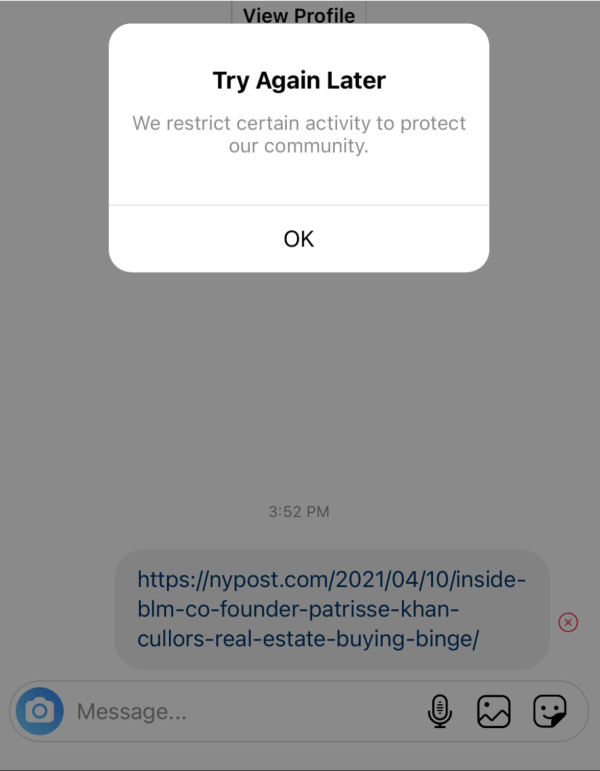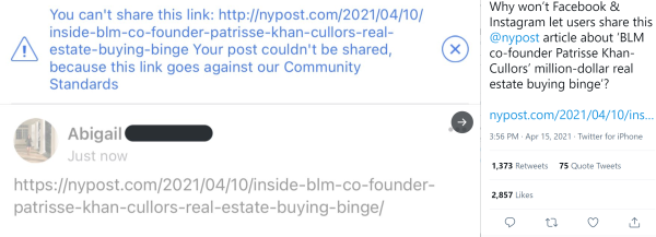 Instagram blocks sharing of NY Post article about BLM co-founder's controversial property acquisitions: Instagram was acquired by Facebook in 2012, therefore, restrictions and bans of users, or content, usually carry across platforms. Since Facebook blocked its users' ability to share a New York Post article exposing Black Lives Matter co-founder Patrisse Khan-Cullors' controversial multi-million dollar real estate empire, so did Instagram. Facebook said the article was a violation of its policy on privacy and personal information. Furthermore, a New York Times media reporter detailed on Twitter that Facebook's reasoning for censoring the article was because it "shared multiple details which could identify the residence of one of the BLM founders, in violation of her privacy rights." Both Facebook and Instagram have also reportedly blocked users' ability to share the article via private messaging. Amid the controversy, BLM put out a statement this week defending Cullors. In it, the political organization remarked that the reporting on Cullors' real estate properties "continues a tradition of terror by white supremacists against Black activists."