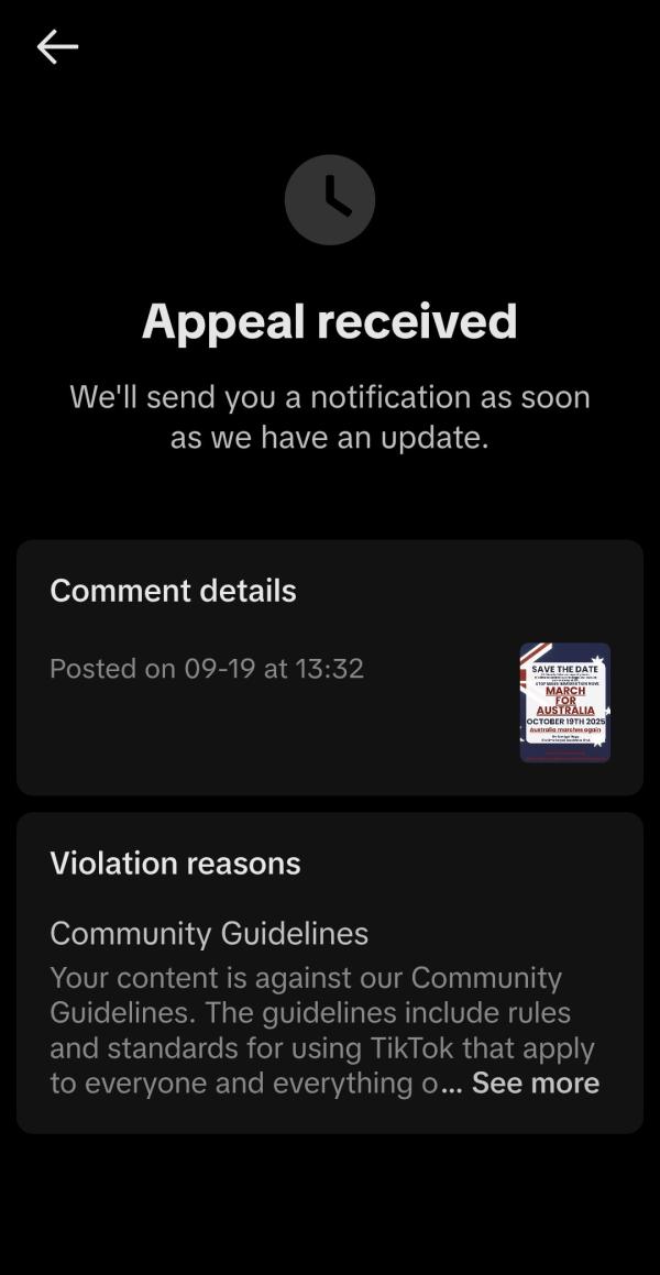 TikTok removes comment about an immigration march: An X user shared a screenshot of his TikTok censorship notice. The user had posted a poster advertising an anti-immigration march in Australia. The poster read "Save the Date: It's time to take our country back. It's time to defend our heritage, our culture and our way of life. STOP MASS IMMIGRATION NOW. March for Australia. October 19th 2025. Australia marches again. No foreign flags. It's time to put Australia first." The poster also included a web site and Facebook page for the march. TikTok removed the post, stating that it violated the platform's community guidelines, but did not specify which one.
