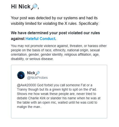 X censors user's post about the Charlie Kirk assassination: An X user shared a screenshot of his censorship notice. The user had posted "God forbid you call someone Fat or a Tranny though but it's a green light to spit on the d*ad. Shows me how weak these people are, never tried to debate Charlie Kirk or slander his name when he was at the table with an open mic, waited until he was cold to malign the man.." X claimed this post violated its "rules against Hateful Conduct." The post's visibility was limited as a result.
