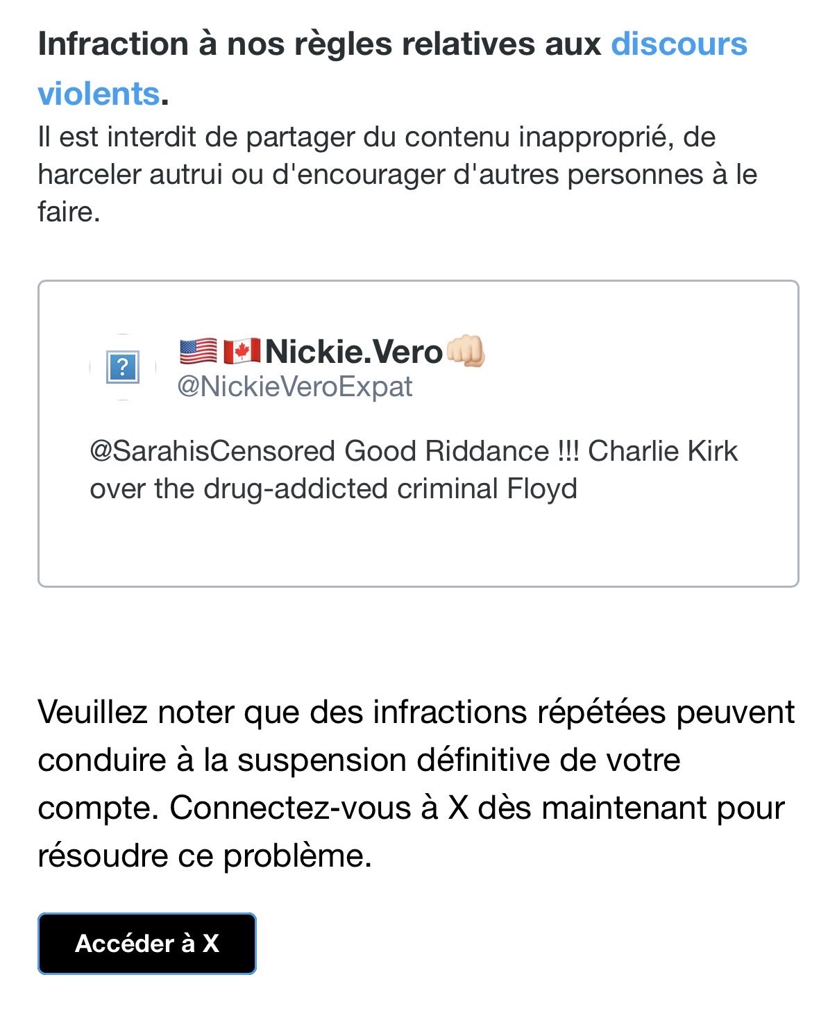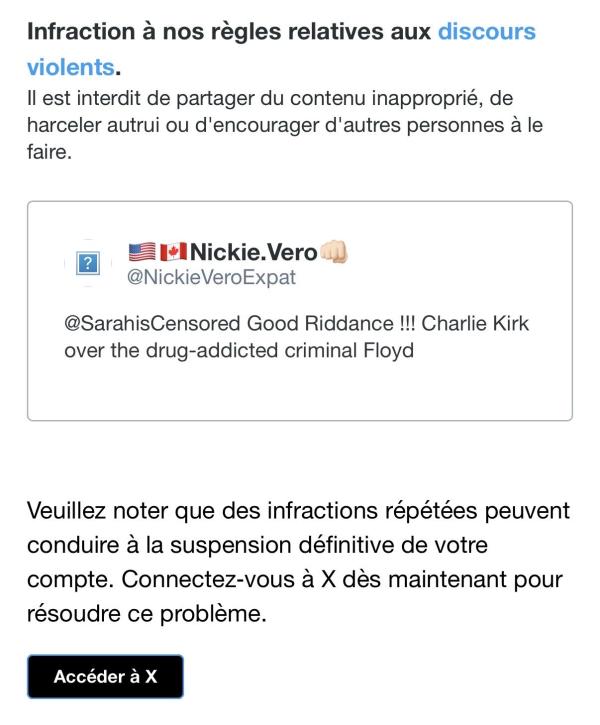X censors user's post about Charlie Kirk's assassination: An X user shared a screenshot of her censorship notice. The user had posted "Good Riddance !!! Charlie Kirk over the drug-addicted criminal Floyd." X claimed the post violated its rules against abusive speech. The post was removed.