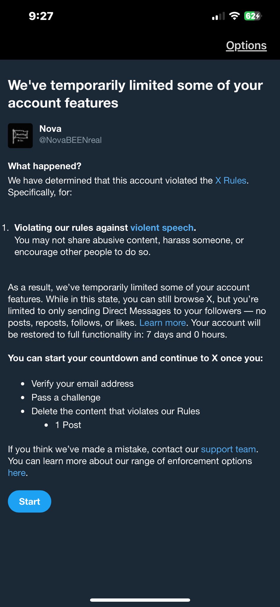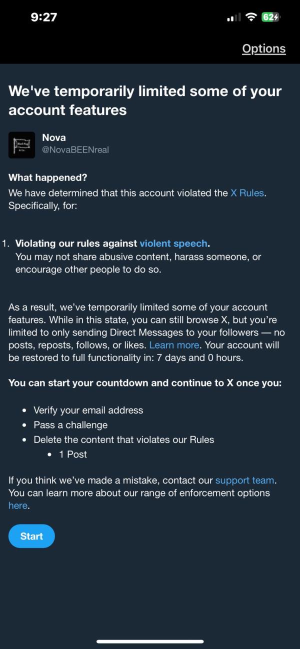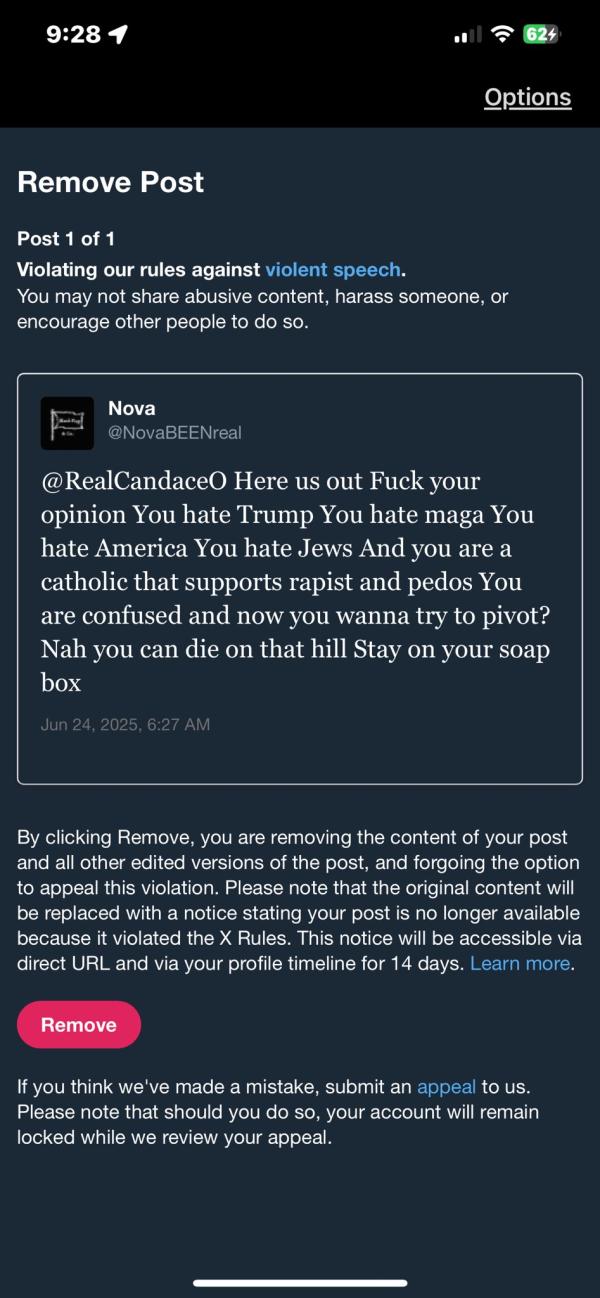 X censors user for rant about Candace Owens: An X user shared a screenshot that was sent by the platform. The user had posted "@RealCandaceO Here [sic] us out Fuck your opinion You hate Trump You hate maga You hate America You hate Jews And you are a catholic that supports rapist and pedos You are confused and now you wanna try to pivot? Nah you can die on that hill Stay on your soap box." X claimed the post violated its "rules against violent speech." The user's account was restricted to read-only mode and the post was removed.