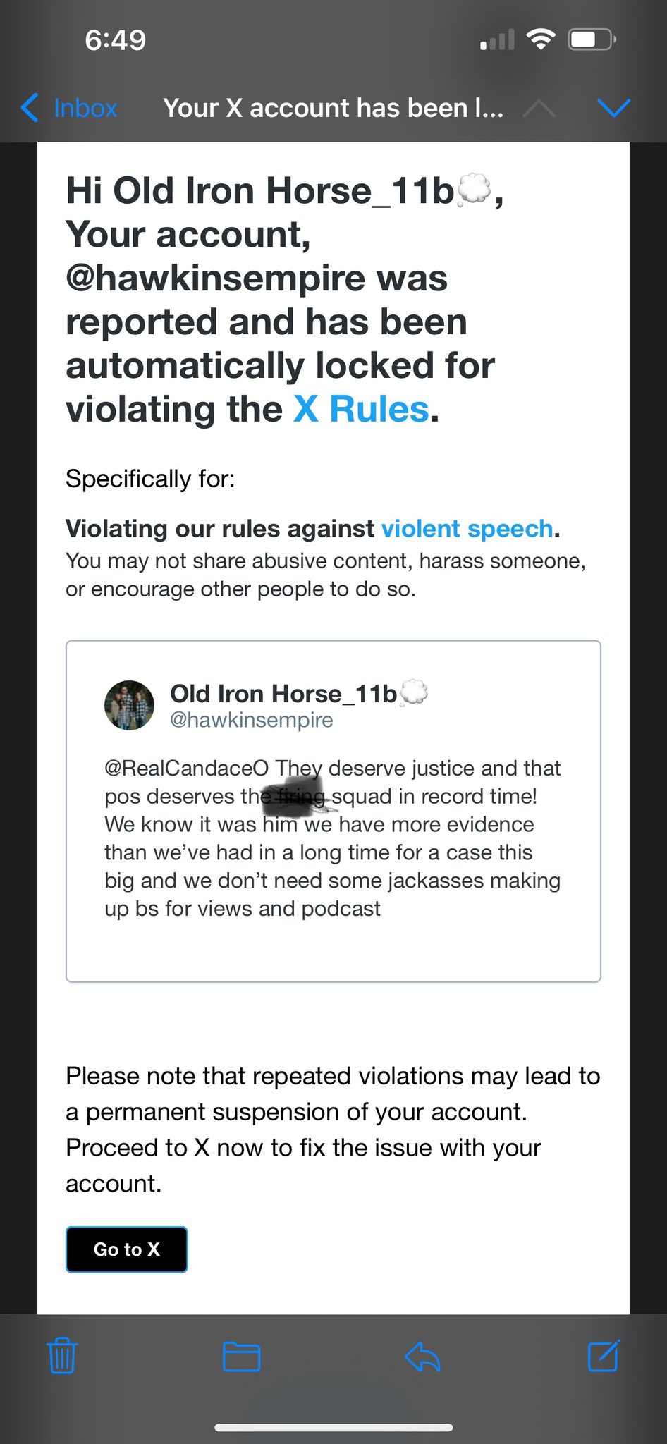 X censors user's post calling for the death penalty for a murderer: An X user shared a screenshot of his censorship notice. The user had posted "They deserve justice and that pos deserves the firing squad in record time! We know it was him we have more evidence than we've had in a long time for a case this big and we don't need some jackasses making up bs for views and podcast." This comment was in reference to Charlie Kirk's assassination. The user's account was locked and the comment was removed with X citing its "rules against violent speech," despite the fact that the death penalty is a valid form of criminal punishment in many states in the country and at least one state provides the option for a firing squad.