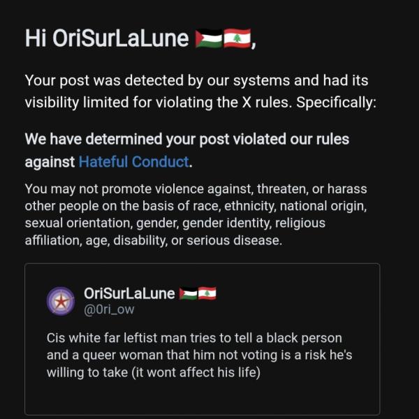 X censors user's post discussing voting: An X user shared a screenshot of her censorship notice. The user had posted "Cis white far leftist man tries to tell a black person and a queer woman that him not voting is a risk he's willing to take (it wont [sic] affect his life)." The user's comment's visibility was limited by X citing its "rules against hateful conduct."