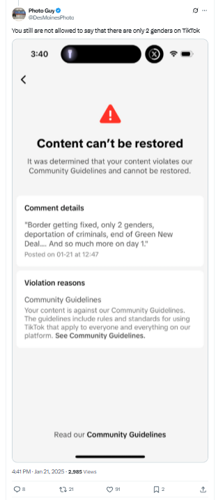 TikTok removed user's comment: An X user shared a screenshot of his TikTok censorship notice. The user had commented, "Border getting fixed, only 2 genders, deportation of criminals, end of Green New Deal.... And so much more on day 1." TikTok determined that the comment violated its community guidelines and cannot be restored. TikTok did not indicate how the post violated its community guidelines.
