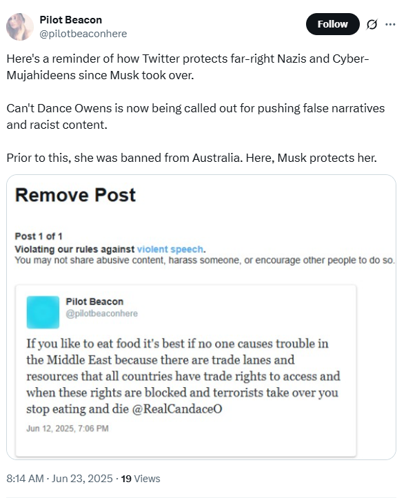 The user posted a screenshot of the removal on her X account. The post that was removed stated, "If you like to eat food it's best if no one causes trouble in the Middle East because there are trade lanes and resources that all countries have trade rights to access and when these rights are blocked and terrorists take over you stop eating and die @RealCandaceO" Not sure if an appeal was requested.