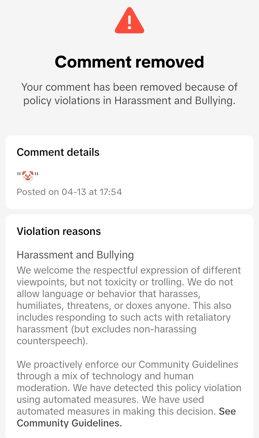 TikTok censors user's comment: An X user shared a screenshot of their TikTok censorship notice. The user had commented on another user's post with just a clown emoji: "🤡" According to the screenshot, TikTok claimed the comment violated its "Community Guidelines" but did not specify which rule was violated. The comment was deleted by the platform.