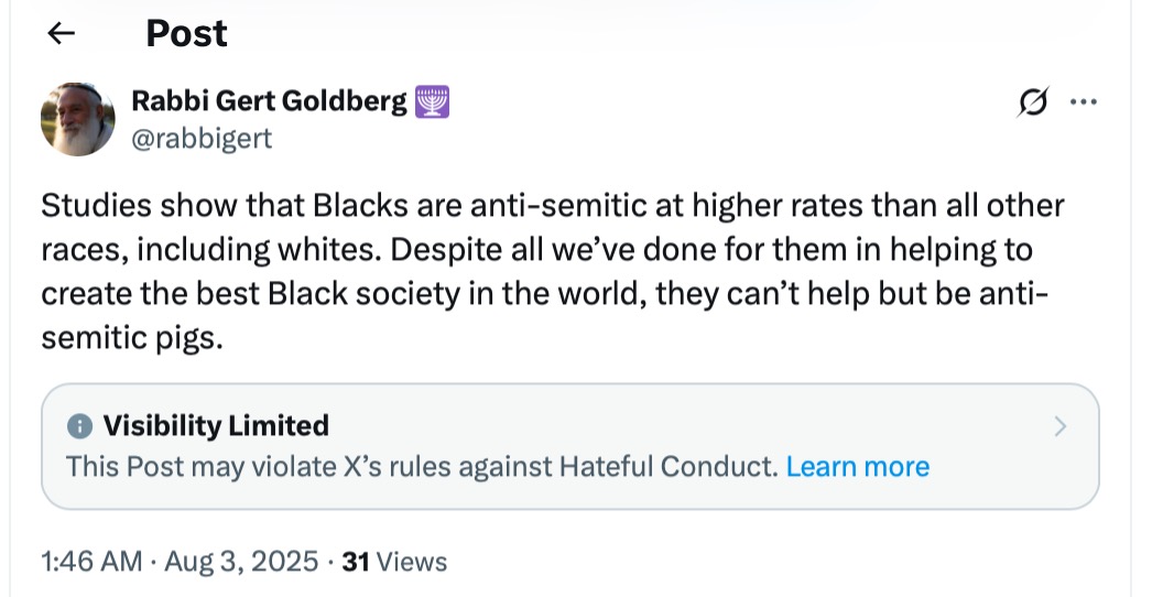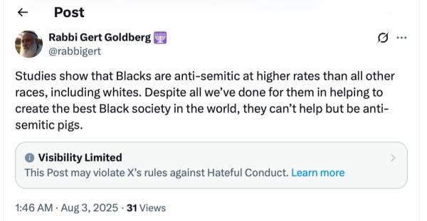 X censors user's post about antisemitism: An X user shared a screenshot of the censorship notice sent by X. The user had posted "Studies show that Blacks are anti-semitic at higher rates than all other races, including whites. Despite all we've done for them in helping to create the best Black society in the world, they can't help but be anti-semitic pigs." X flagged the post, stating that its visibility had been limited because it "violated our rules against Hateful Conduct."