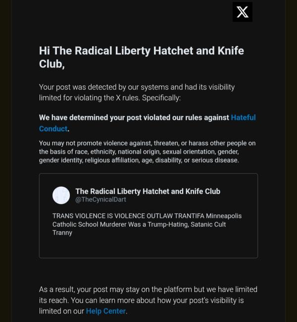 X censors user's post about transgender violence: An X user shared a screenshot of the censorship notice sent by X. The user had posted "TRANS VIOLENCE IS VIOLENCE OUTLAW TRANTIFA Minneapolis Catholic School Murderer Was a Trump-Hating, Satanic Cult Tranny." The post was flagged by X as problematic, stating "Visibility limited: this Post may violate X's rules against Hateful Conduct."