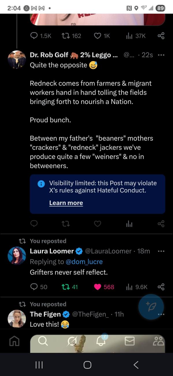 X censors user's post: An X user shared a screenshot of his censorship notice. The user had posted "Quite the opposite. Redneck comes from farmers & migrant workers hand in hand tolling [sic] the fields and bringing forth to nourish a Nation. Proud bunch. Between my father's 'beaners' mothers 'crackers' & 'redneck' jackers we've produce [sic] quite a few 'weiners' & no in betweeners." X limited the visibility of the post, stating that it "may violate X's rules against Hateful Conduct."