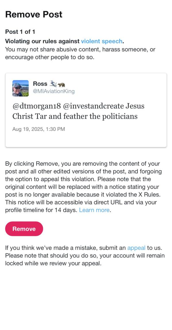 X censors user's post using a common phrase: An X user shared a screenshot of his censorship notice. He had posted "Jesus Christ Tar and feather the politicians." X found this to violate its "rules against violent speech," according to the screenshot. The post was deleted, and the user reported a 12-hour read-only account restriction, but this could not be confirmed.