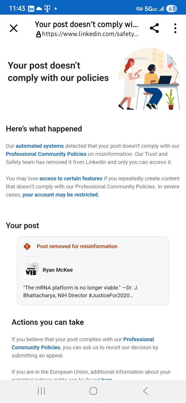 LinkedIn removes quote from NIH director, calling it "misinformation": A user on X complained that LinkedIn censored a post in which he quoted Dr. Jay Bhattacharya, Director of the National Institutes of Health (NIH) under President Donald Trump. The user shared a screenshot of his censorship notice, showing that he had posted "'The mRNA platform is no longer viable.' - Dr. J. Bhattacharya, NIH Director #Justicefor2020..." to his LinkedIn page. The social media platform aimed at career-related content claimed that the "post doesn't comply with [their] policies." The notice continued, stating that LinkedIn's "automated systems detected that your post doesn't comply with our Professional Community Policies on misinformation."