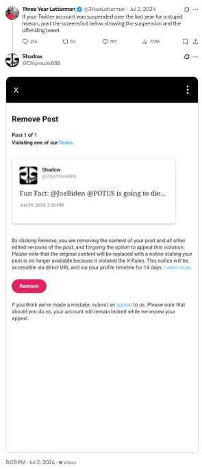 X censors a user's post: A user on X posted "Fun Fact: @JoeBiden @POTUS is going to die..." According to a screenshot shared by the user, X removed the post for "Violating one of [its] rules." It is unclear which rule was violated.