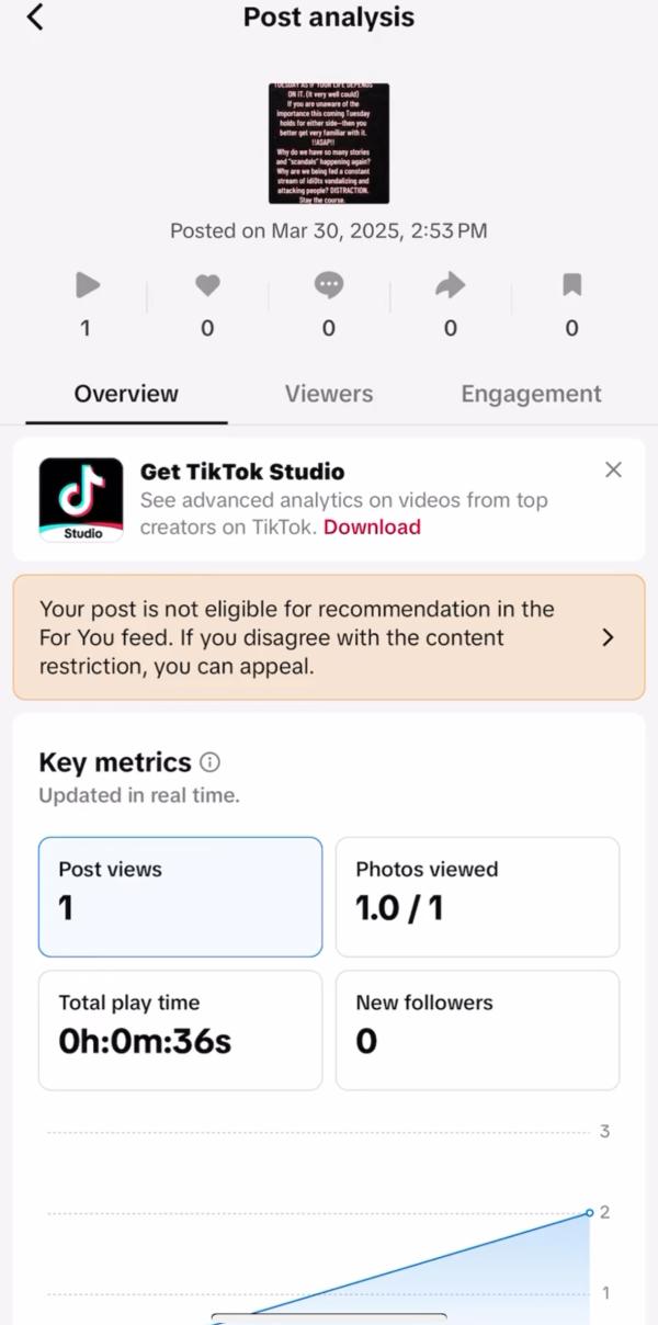 TikTok suppresses post encouraging people to vote: User Shann posted a video on X March 30 showing her TikTok post, “GET OUT AND VOTE BEFORE TUESDAY AS IF YOUR LIFE DEPENDS ON IT. (It very well could) If you are unaware of the importance this coming Tuesday holds for either side—then you better get very familiar with it. !!ASAP!! Why do we have so many stories and ‘scandals’ happening again? Why are we being fed a constant stream of idiots vandalizing and attacking people? DISTRACTION. Stay the course.” TikTok subsequently sent a notification, “Your post is not eligible for recommendation in the For You feed. If you disagree with the content restriction, you can appeal.”