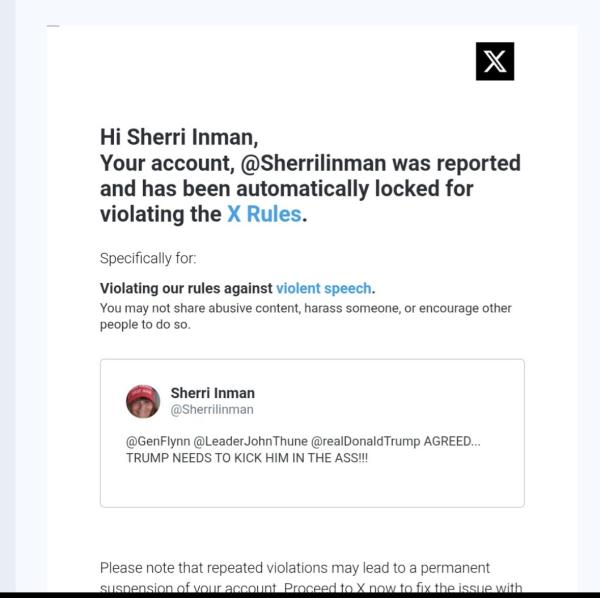 X locks user’s account for colloquial expression: Sherri Inman posted on Nov. 14 in response to a now-deleted post, “I did as well.. also fighting against X..5 times limit reach jail and this..My VIOLENT SPEECH..7 days locked.” It is not clear from her screenshot exactly which day the censorship occurred. The screenshot of her notification from X showed her post, “@GenFlynn @LeaderJohnThune @realDonaldTrump AGREED…TRUMP NEEDS TO KICK HIM IN THE ASS!!!” X accused her of breaking “our rules against violent speech.”