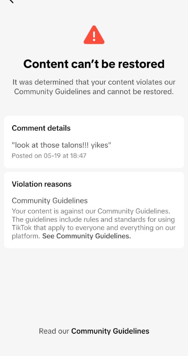 TikTok removed comment about the talons on two young eaglets on an eagle cam: An X user shared a screenshot of his TikTok censorship notice. The user had commented "look at those talons!!! yikes." This was in response to seeing how big two eaglets on the Bear Lake eagle came had grown in two months, according to the user. TikTok removed the comment, claiming that it violated the platform's "Community Guidelines," but did not say how this was true.