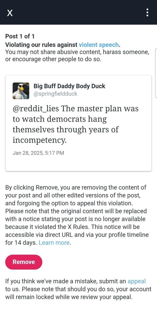 X censors user post for using a common euphemism: An X user shared a screenshot of his censorship notice. The user had posted "The master plan was to watch democrats hang themselves through years of incompetency." X claimed this post violated its "rules against violent speech." The user was required to delete the post.