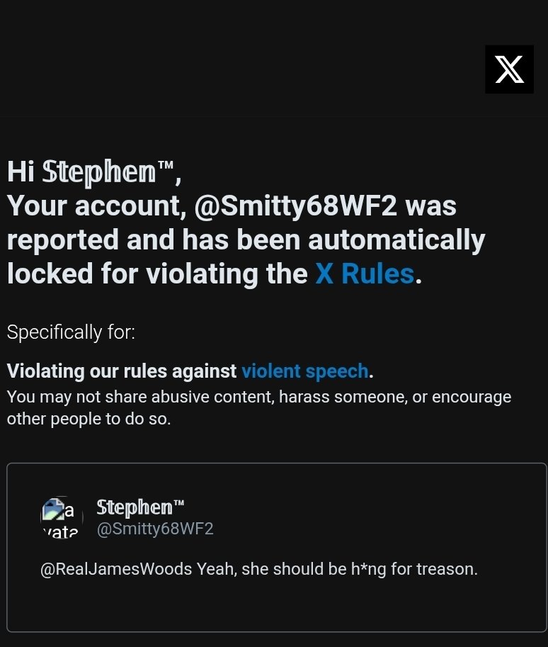 X censors user's post calling for Hillary Clinton to be prosecuted: An X user shared a screenshot of his censorship notice. The user posted a response to a James Woods post about Hillary Clinton, saying "Yeah, she should be h*ng for treason." While hanging is not an outlawed form of capital punishment, and death is the traditional sentence for treason, X claimed the post violated its "rules against violent speech." X locked the user's account and removed the post.