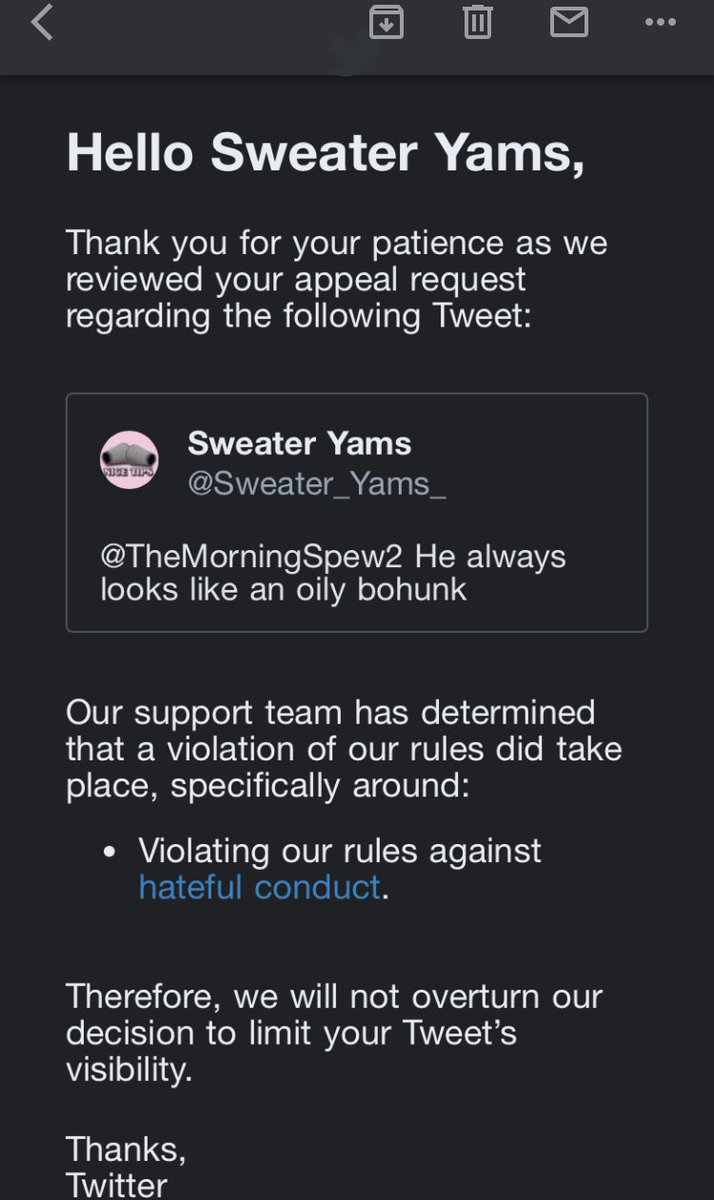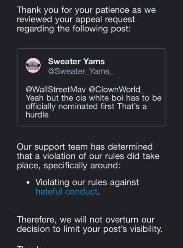 X censors user's post: An X user shared a screenshot of the censorship notice sent by X. The user had posted "Yeah but the cis white boi has to be officially nominated first That's a hurdle." The user also posted "He always looks like an oily bohunk." X flagged the posts, stating that their visibility had been limited because they "violated our rules against Hateful Conduct."