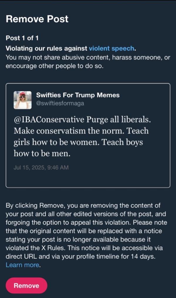X censors user's post about political divisions: An X user shared a screenshot that was received from the platform. The user had posted "Purge all liberals. Make conservatism the norm. Teach girls how to be women. Teach boys how to be men." X claimed the post violated its "rules against violent speech" and required the post be deleted as a result.